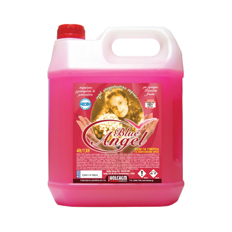 Κρεμοσάπουνο Blue Angel. Υγρό καθαριστικό χεριών με άρωμα passion fruit. Με πλούσιο αφρό που αφήνει ευχάριστο άρωμα στα χέρια με ουδέτερο Ph. Καθαρίζει και περιποιείται τα χέρια λόγω της περιεκτικότητας του σε γλυκερίνη και μπεταΐνη. Το κρεμοσάπουνο Blue Angel διατίθεται σε οικονομική συσκευασία των 4lt.
