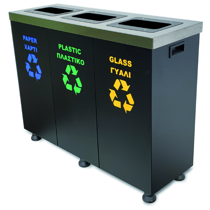 Τριπλός κάδος ανακύκλωσης για χαρτί, πλαστικό και γυαλί από ανθεκτικό υλικό, κατάλληλος για HACCP.