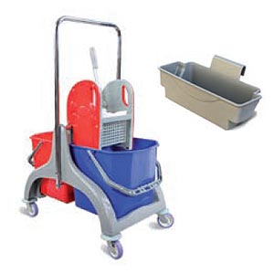 Καρότσι σφουγγαρίσματος διπλό σε πλαστική βάση. Διαθέτει δύο κάδους χωρητικότητας 25lt, πρέσα σφουγγαρίστρας. Υπάρχει θέση για δοχείο αποθήκευσης.