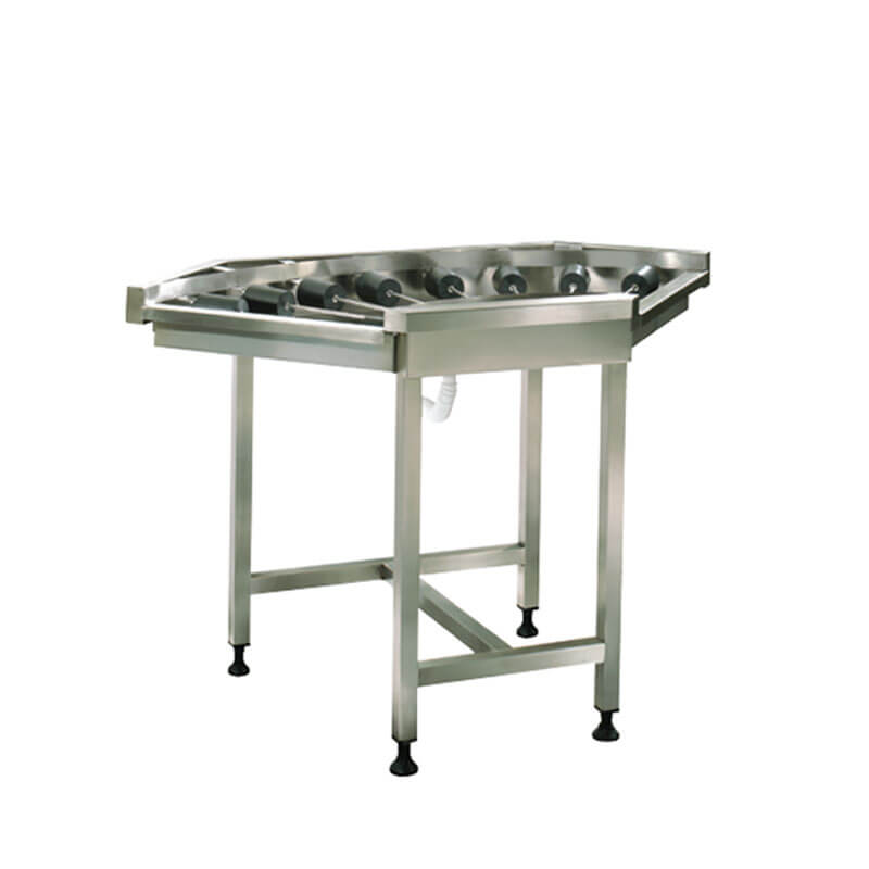 Πάγκος μεταφοράς με γωνία 90°. Με ροδέλες κύλισης για μεγαλύτερη ευκολία, φτιαγμένος από ανοξείδωτο.