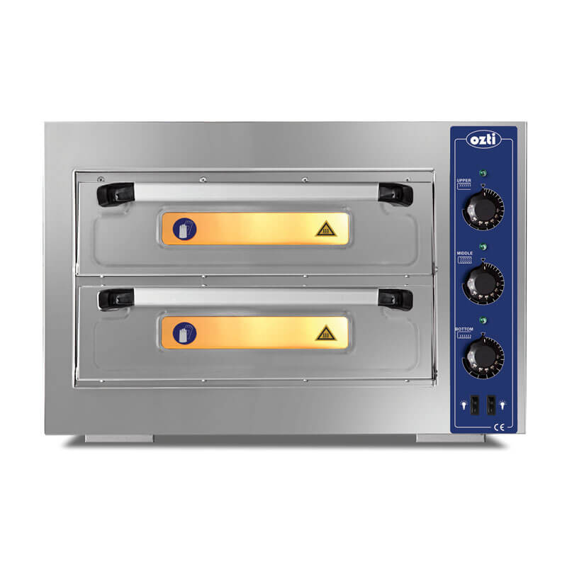 Φούρνος πίτσας διπλός ανοξείδωτος, με διακόπτες λειτουργίας και θερμοστάτη.