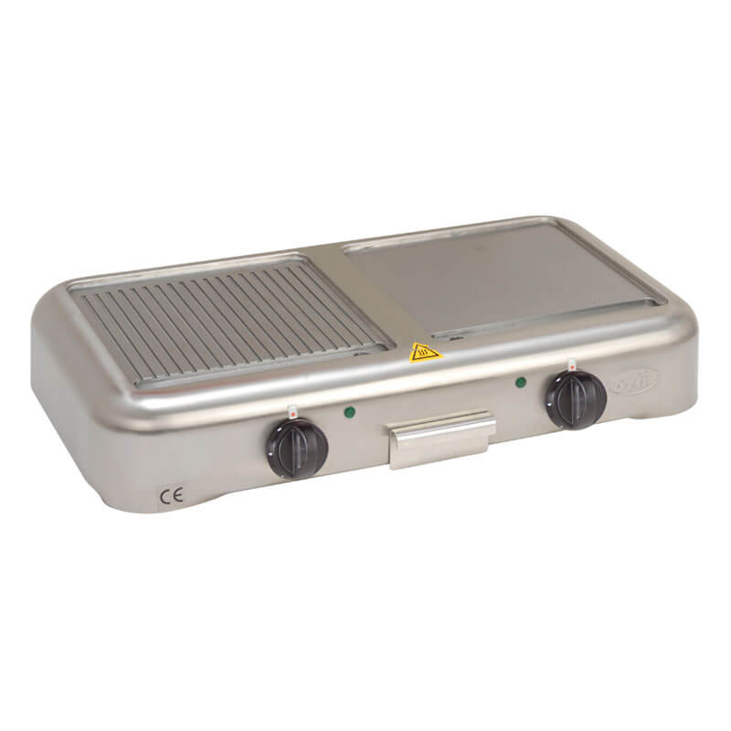 Πλατώ ψησίματος με λεία και ριγωτή επιφάνεια για γρήγορο και τέλειο ψήσιμο. Η κατασκευή είναι από ανοξείδωτο και διαθέτει δύο ρυθμιστές θερμοκρασίας.