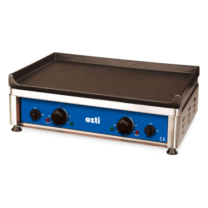 Πλατώ ψησίματος με λεία επιφάνεια για γρήγορο και τέλειο ψήσιμο. Η κατασκευή είναι από ανοξείδωτο και διαθέτει δύο θερμοστάτες και δύο ρυθμιστές θερμοκρασίας.