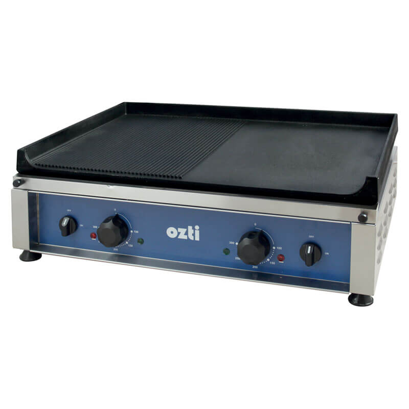 Πλατώ ψησίματος με λεία και ριγωτή επιφάνεια για γρήγορο και τέλειο ψήσιμο. Η κατασκευή είναι από ανοξείδωτο και διαθέτει δύο θερμοστάτες και δύο ρυθμιστές θερμοκρασίας.